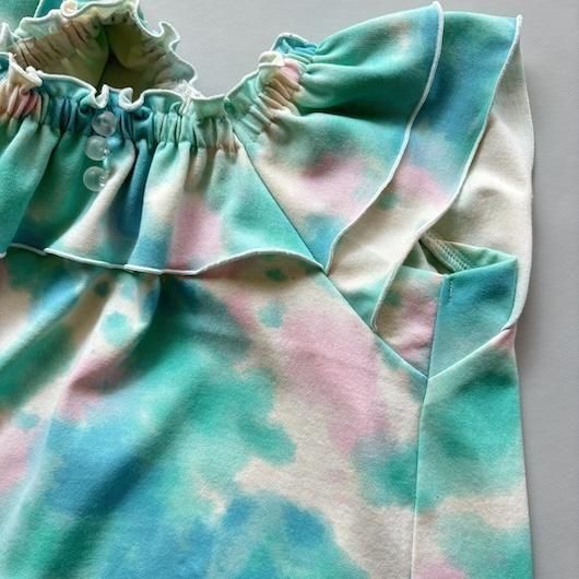 ニット地で作成、フリルと袖口は巻きロック始末